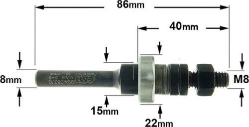 Cet arbre porte fraise CMT est livré avec des bagues de remplissage et un roulement diamètre 22mm, son alésage de 8mm permet de l’utiliser avec les fraises disques de la série référence : 822.