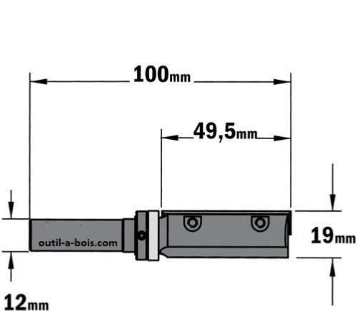 Cette mèche CMT à affleurer a un diamètre de 19 mm, une queue de 12 mm avec roulement, une longueur utile de 49,5 mm et une longueur totale de 100 mm.