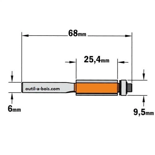 Cette fraise CMT à affleurer est indispensable pour affleurer les stratifiés et laminés. Elle peut également être utilisé pour les travaux de copiage. Elle a un diamètre de 9.5mm et une longueur de coupe de 25.4mm.