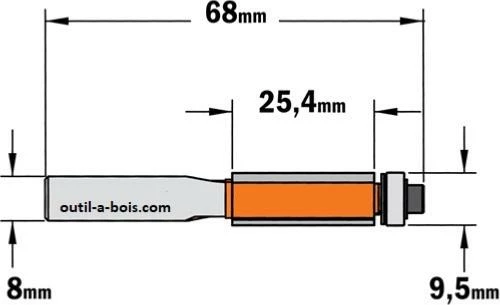 Cette fraise CMT à affleurer est indispensable pour affleurer les stratifiés et laminés. Elle peut également être utilisé pour les travaux de copiage. Elle a un diamètre de 9.5mm et une longueur de coupe de 25.4mm.