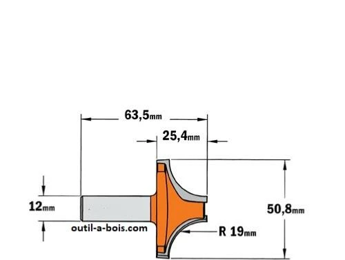 Cette fraise CMT pour quart de rond a un rayon de 19 mm, un diamètre de 50.8 mm, une queue de 12 mm, une longueur utile de 25.4 mm et une longueur totale de 63.5 mm.