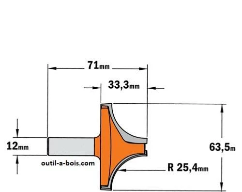 fraise CMT pour quart de rond a un rayon de 25.4 mm, un diamètre de 63.5 mm, une queue de 12 mm, une longueur utile de 33.3 mm et une longueur