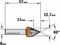 Cette fraise CMT permet de réaliser des rainures en V avec un angle de 60° passant au plat du fond par un rayon de 3mm. Ces outils sont souvent utilisés pour écrire des lettres en relief, le fond plat servant à aplanir le panneau autour des lettres.